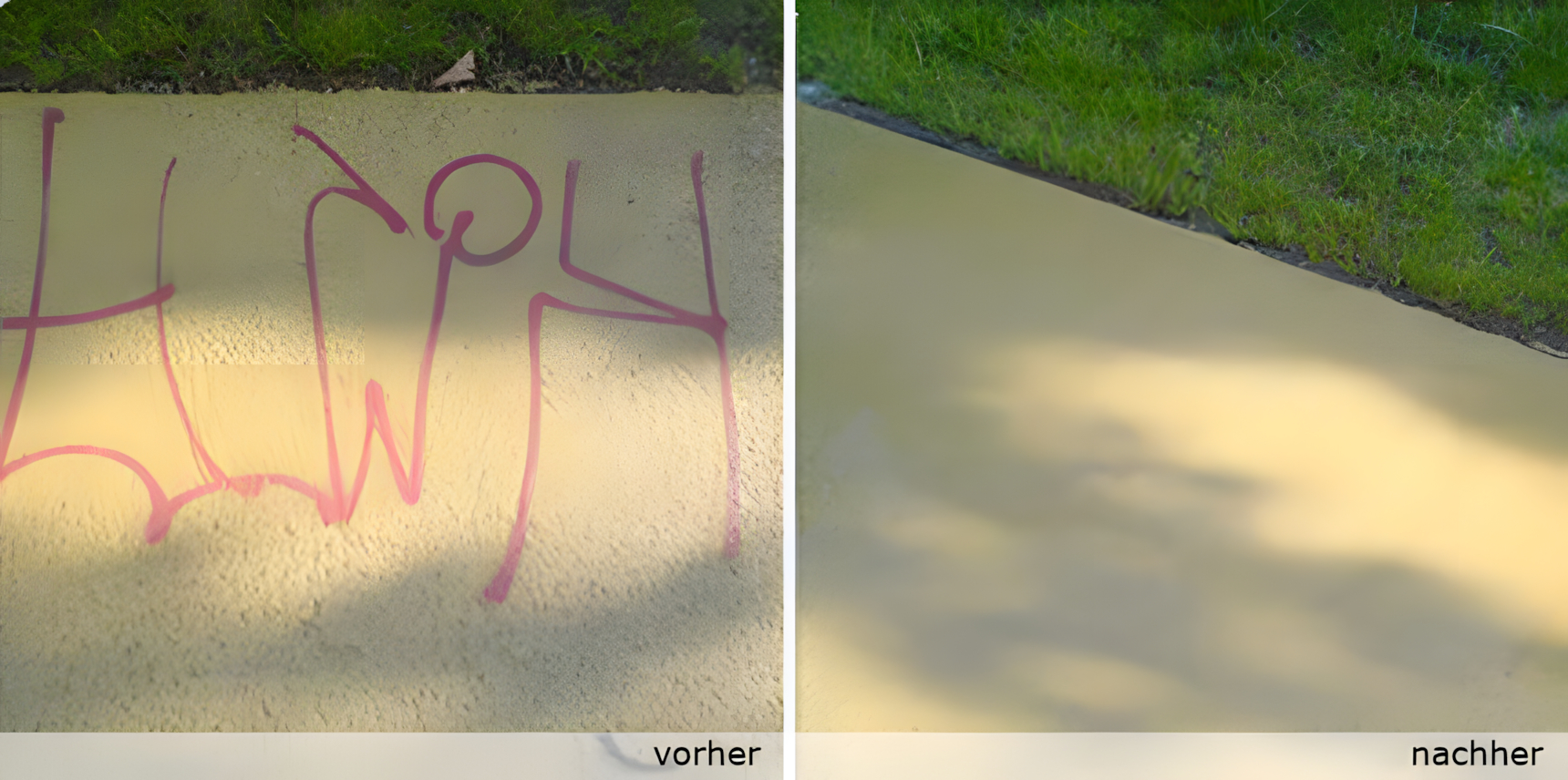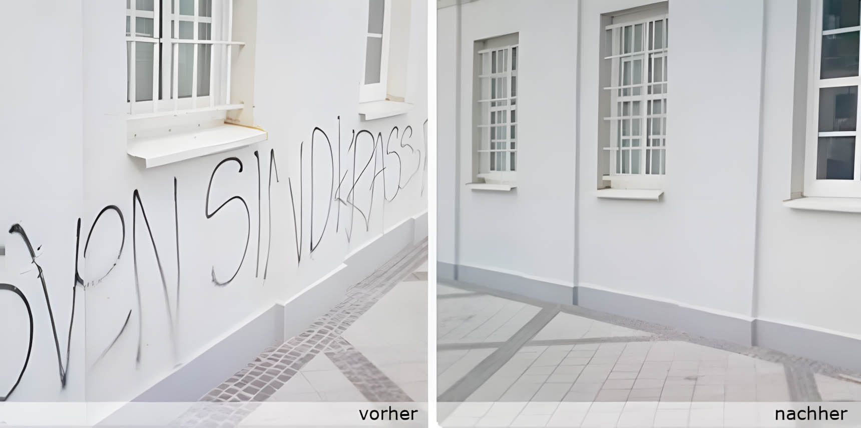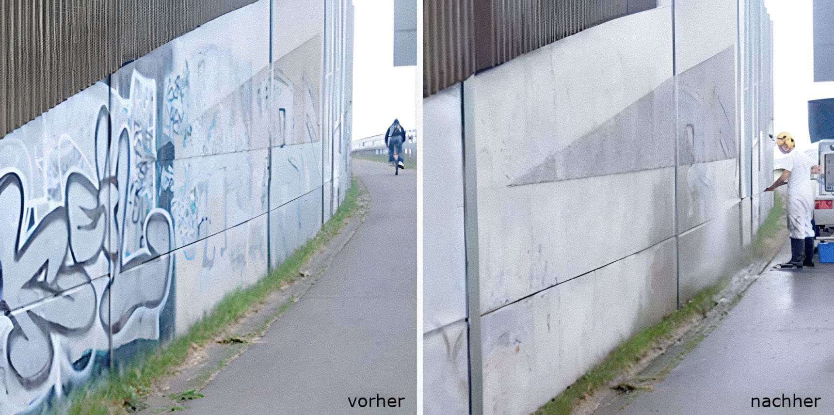 Mittels Hochdrucktechnik entfernen wir schonend hartnäckige Verunreinigungen auf verschiedenen Oberflächen wie z.B. Klinker, Beton, Putz, Naturstein, Fliesen, Holz, Kunststoff und Metall. Der Einsatz einer Hebebühne ermöglicht die Entfernungvon Graffitiy auch an unzugänglichen Stellen.